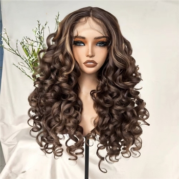 Pelucas delanteras de encaje 13*6, cuerpo largo ondulado, raíz negra, aspecto Natural, Pelo Rizado de mezcla sintética marrón oscuro Chocolate